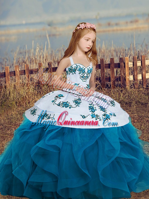 , Sleeveless Floor Length Girls Pageant Dresses and Embroidery and Ruffles