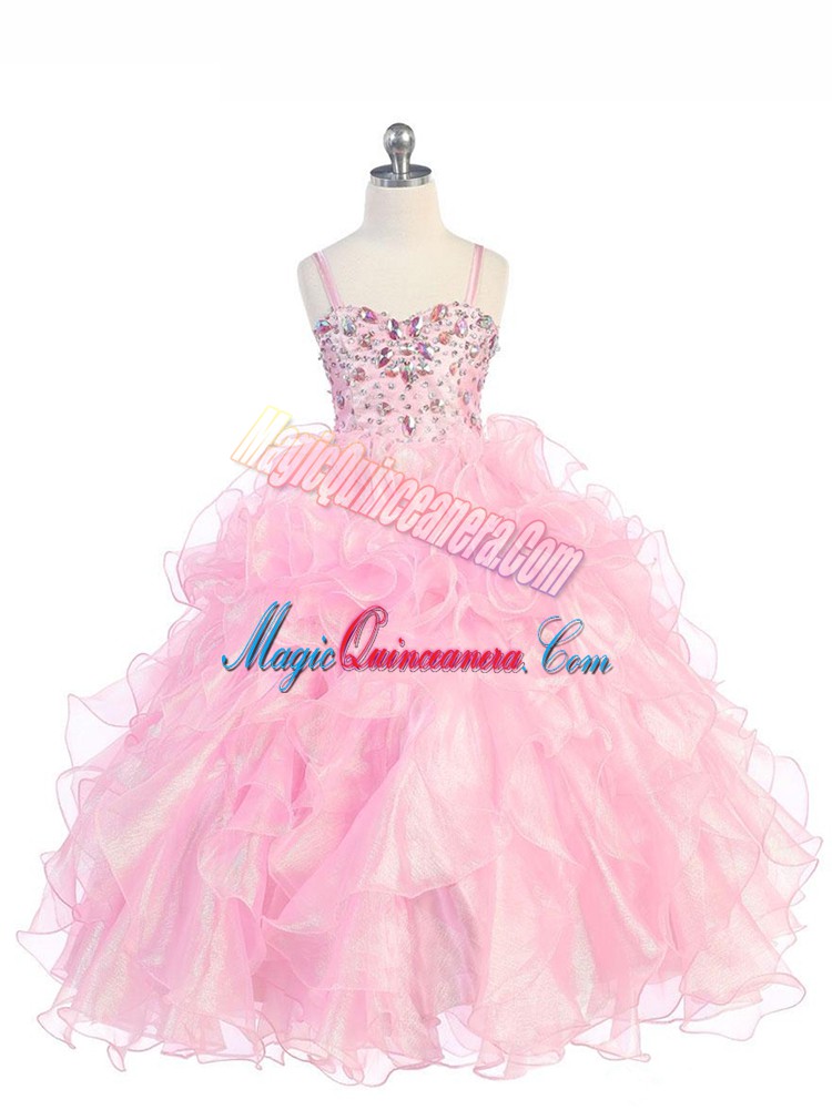 , Sleeveless Lace Up Floor Length Beading and Ruffles Little Girls Pageant Gowns