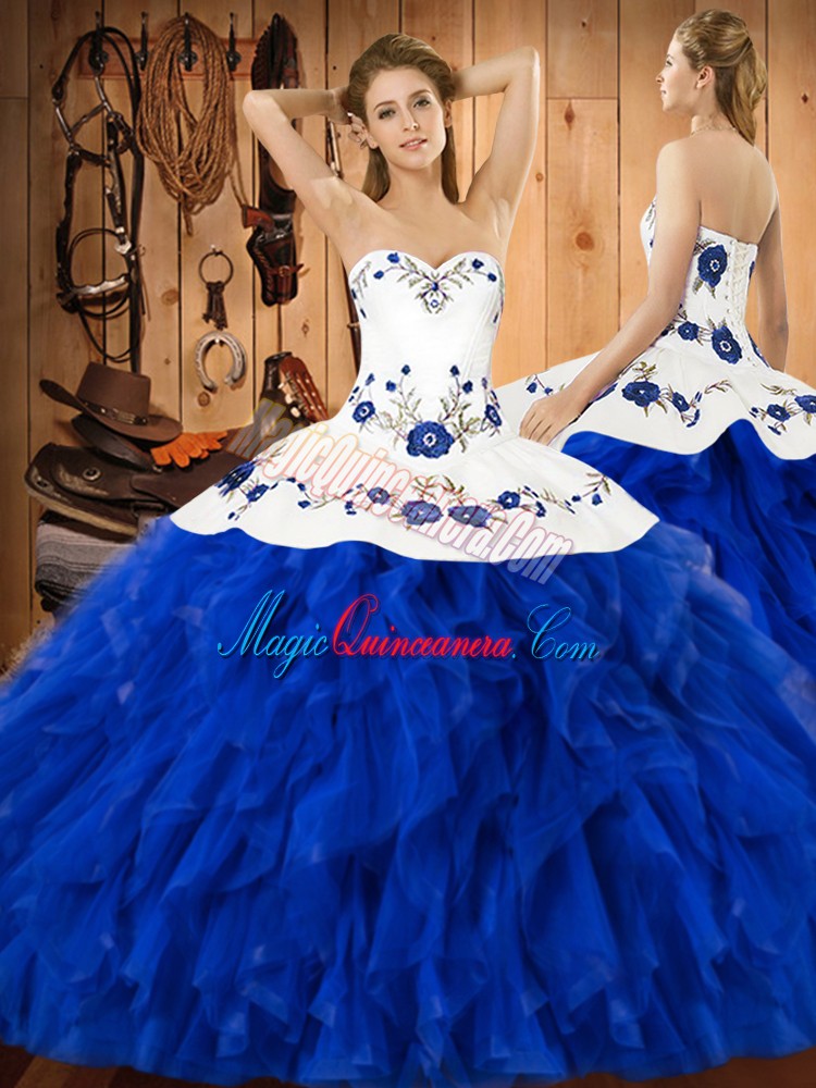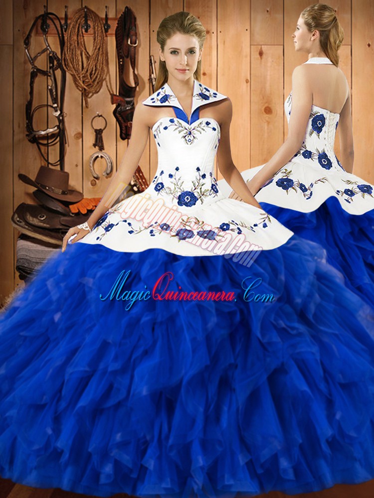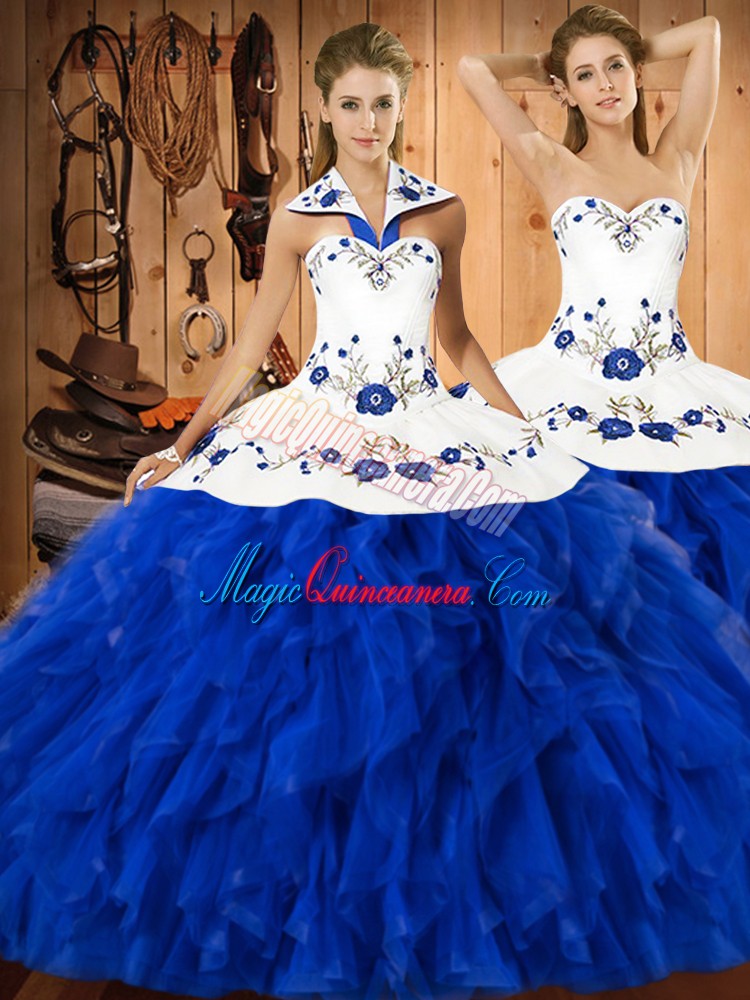 , Sleeveless Lace Up Floor Length Embroidery and Ruffles Ball Gown Prom Dress