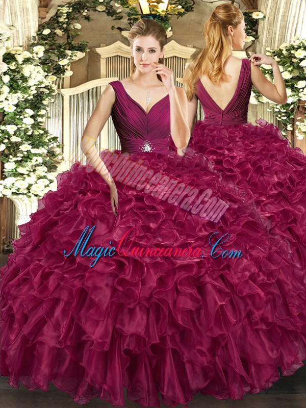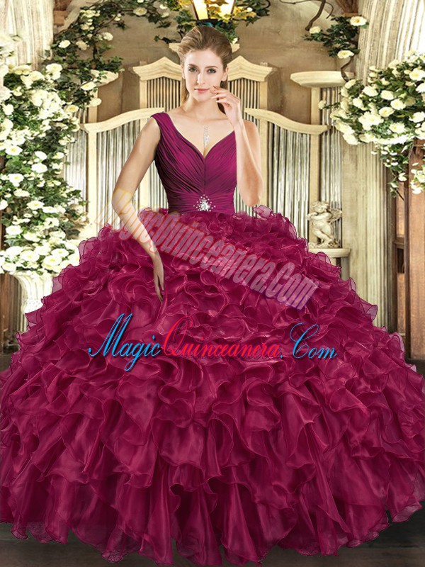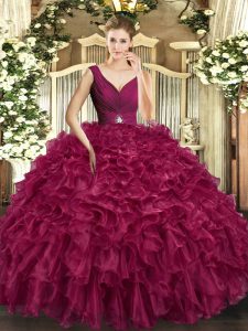 Sleeveless Organza Floor Length Backless Quinceanera Dresses in Burgundy with Beading and Ruffles