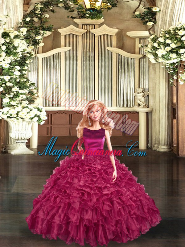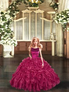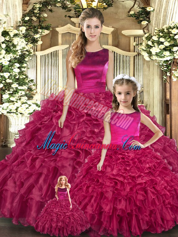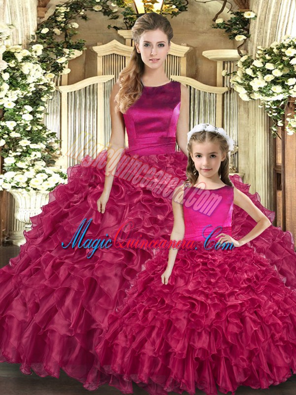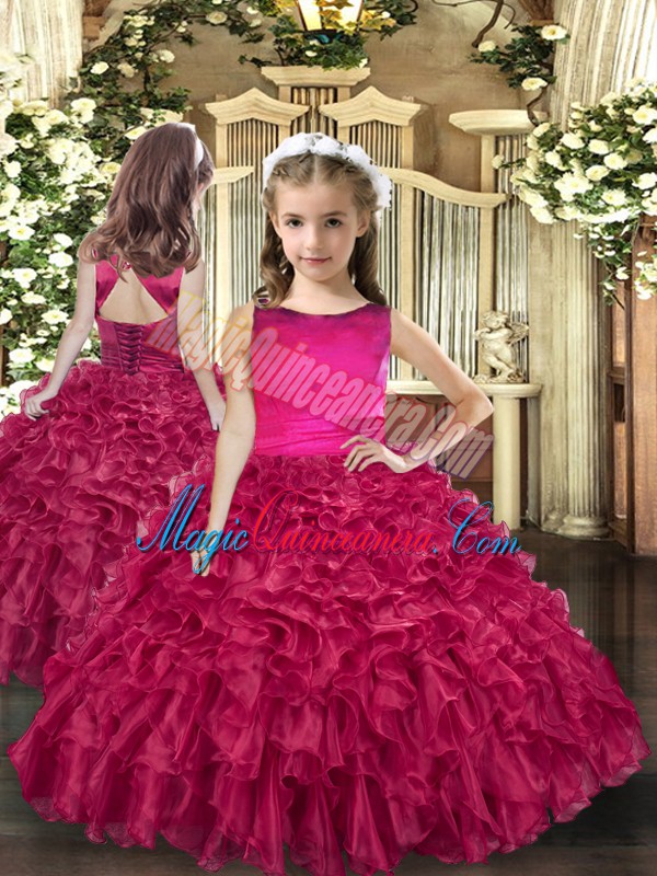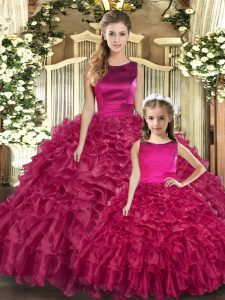 , Sleeveless Organza Floor Length Lace Up Ball Gown Prom Dress in Fuchsia with Ruffles