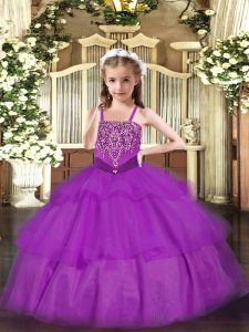 Sleeveless Organza Floor Length Lace Up Girls Pageant Dresses in Purple with Beading and Ruffled Layers