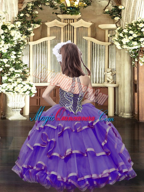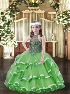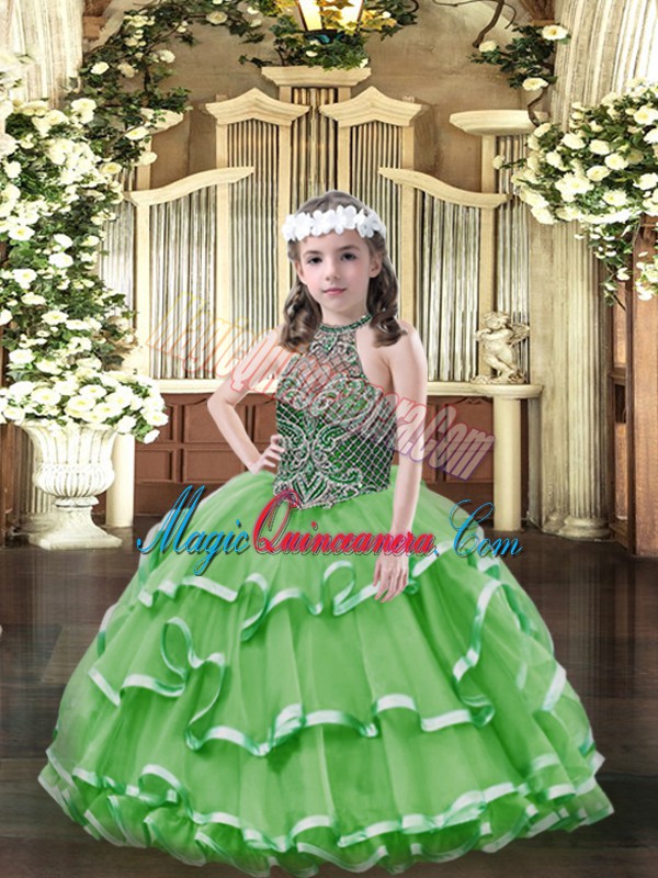 Sleeveless Organza Floor Length Lace Up Glitz Pageant Dress in Green with Beading and Ruffled Layers