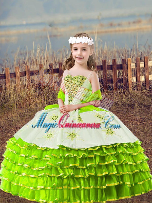 Sleeveless Organza Floor Length Lace Up Little Girl Pageant Gowns in Yellow Green with Beading and Embroidery and Ruffled Layers