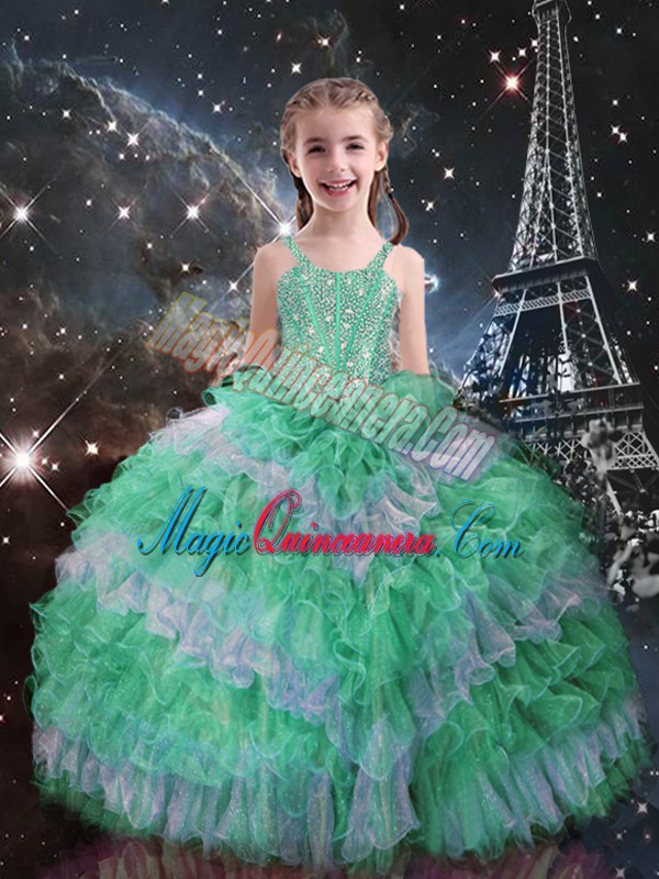 Sleeveless Organza Floor Length Lace Up Pageant Dress for Girls in Apple Green with Beading and Ruffled Layers
