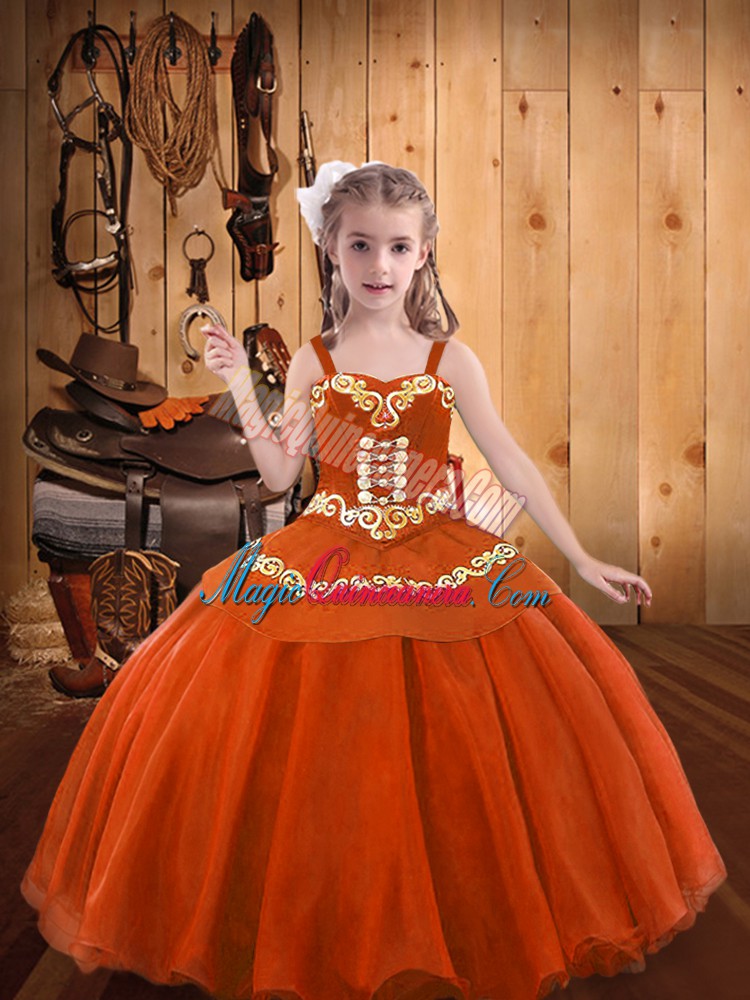 Sleeveless Organza Floor Length Lace Up Pageant Gowns For Girls in Orange Red with Embroidery and Ruffles