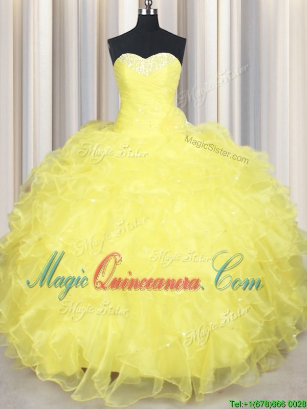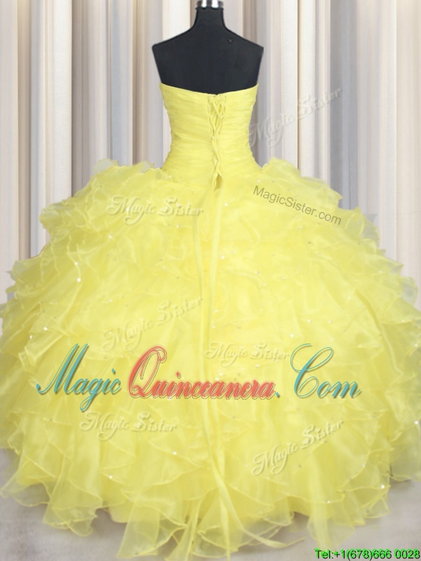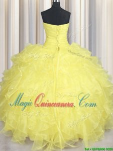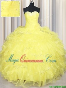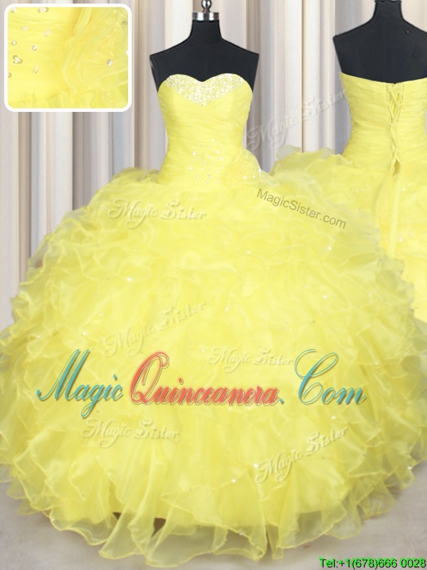 Sleeveless Organza Floor Length Lace Up Quince Ball Gowns in Yellow for with Beading and Ruffles
