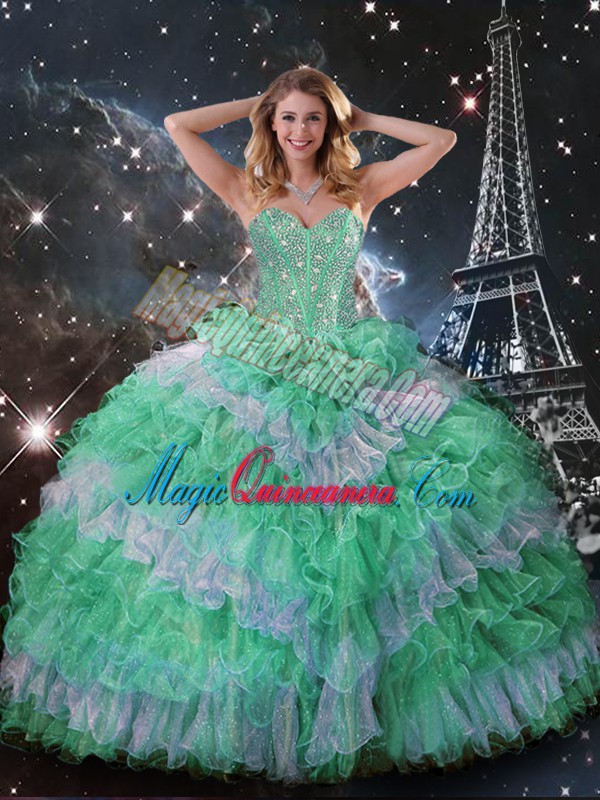 Sleeveless Organza Floor Length Lace Up Sweet 16 Dress in Multi-color with Beading and Ruffled Layers