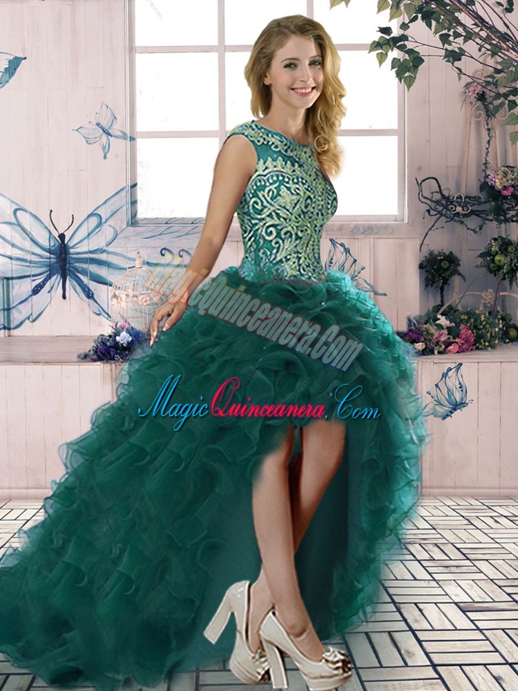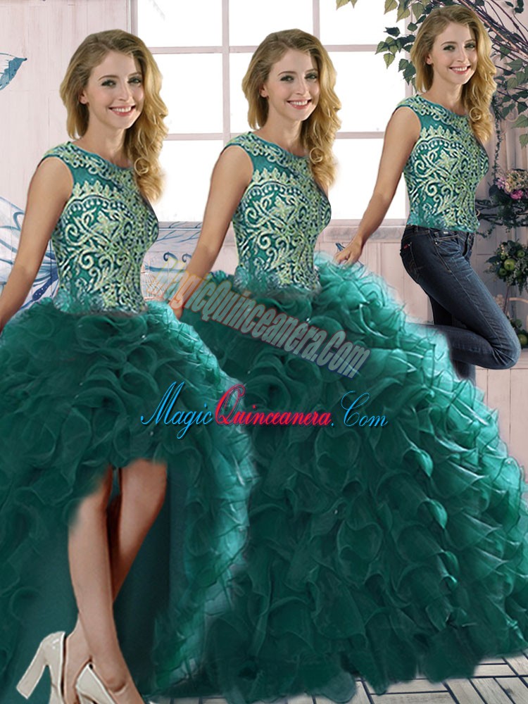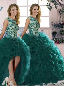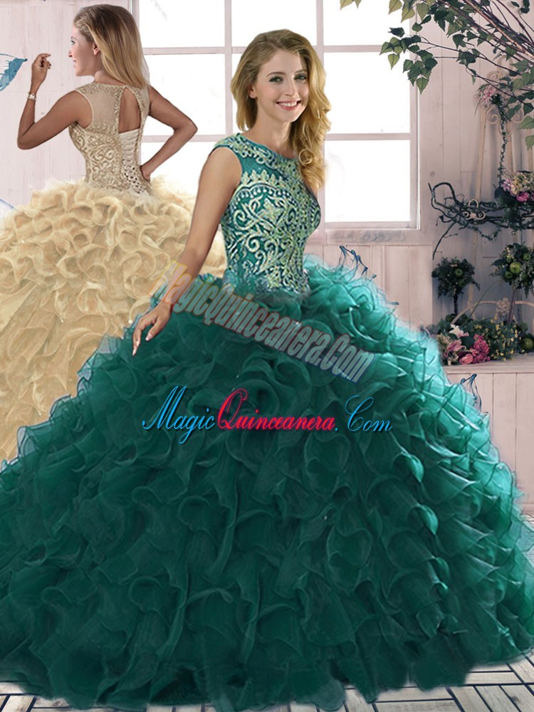 Sleeveless Organza Floor Length Lace Up Vestidos de Quinceanera in Peacock Green with Beading and Ruffles