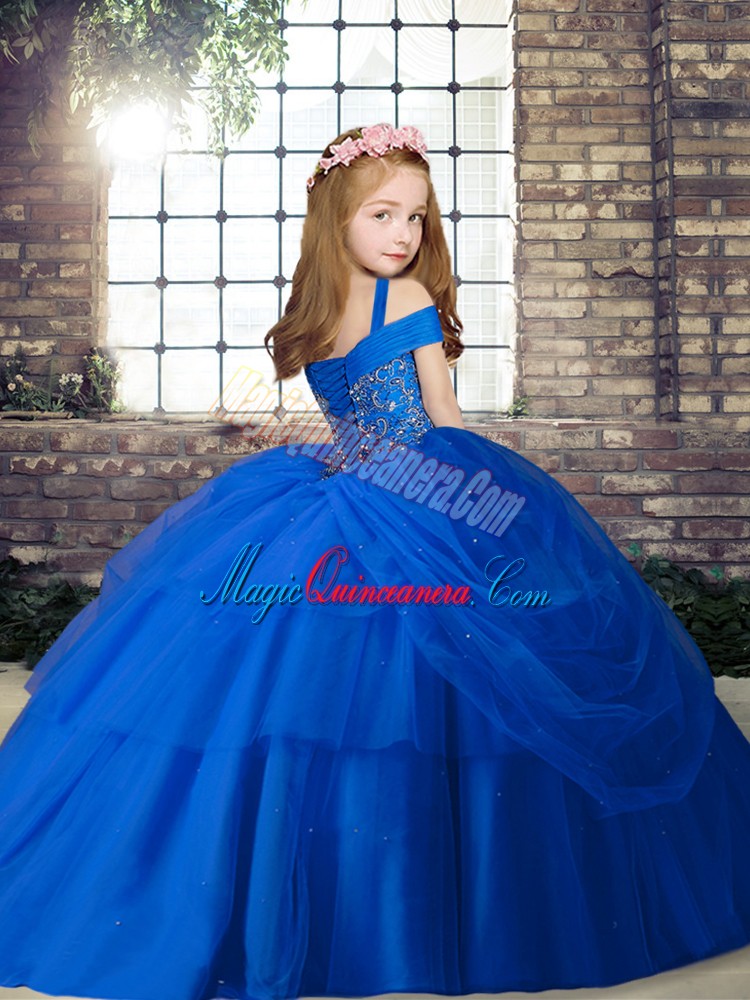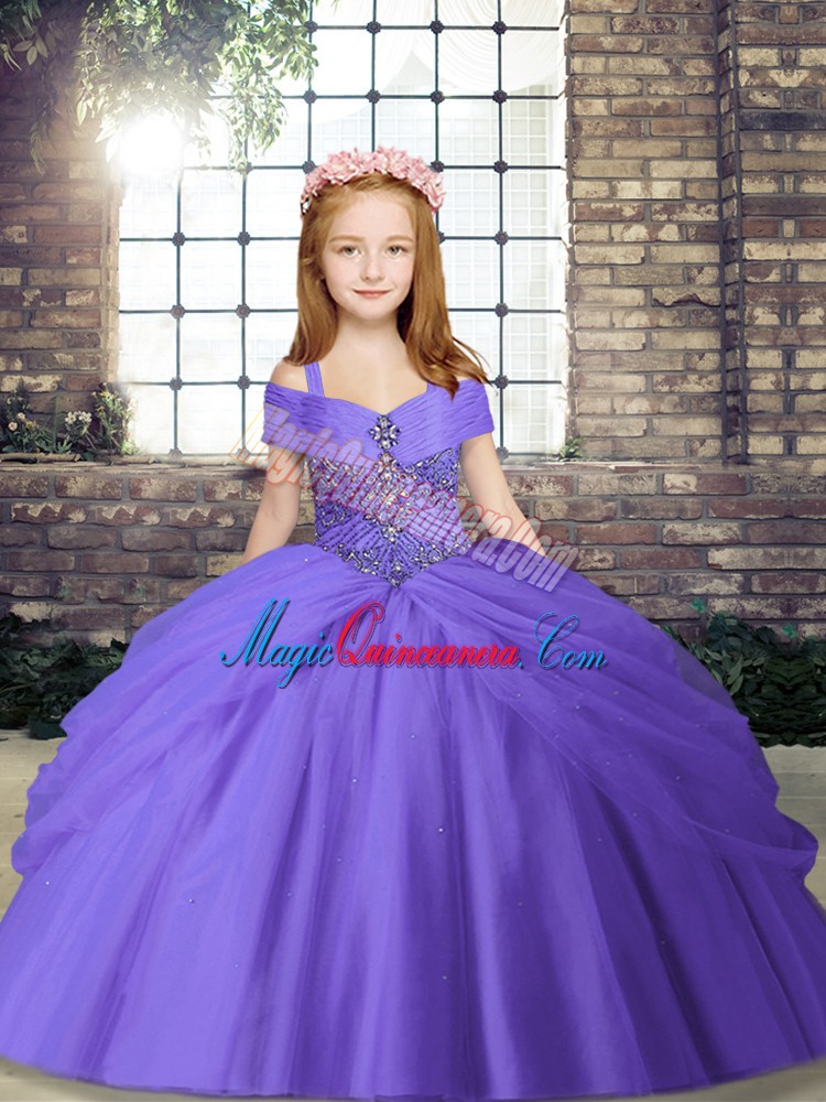 Sleeveless Tulle Floor Length Lace Up Girls Pageant Dresses in Lavender with Beading