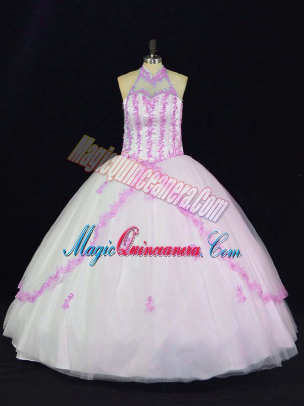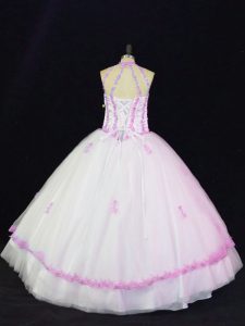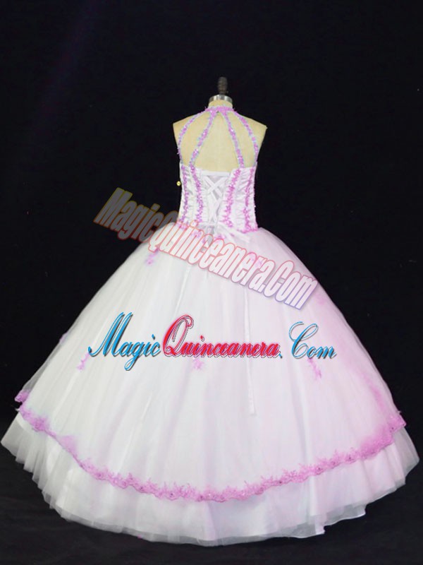 Sleeveless Tulle Floor Length Lace Up Quince Ball Gowns in White with Appliques