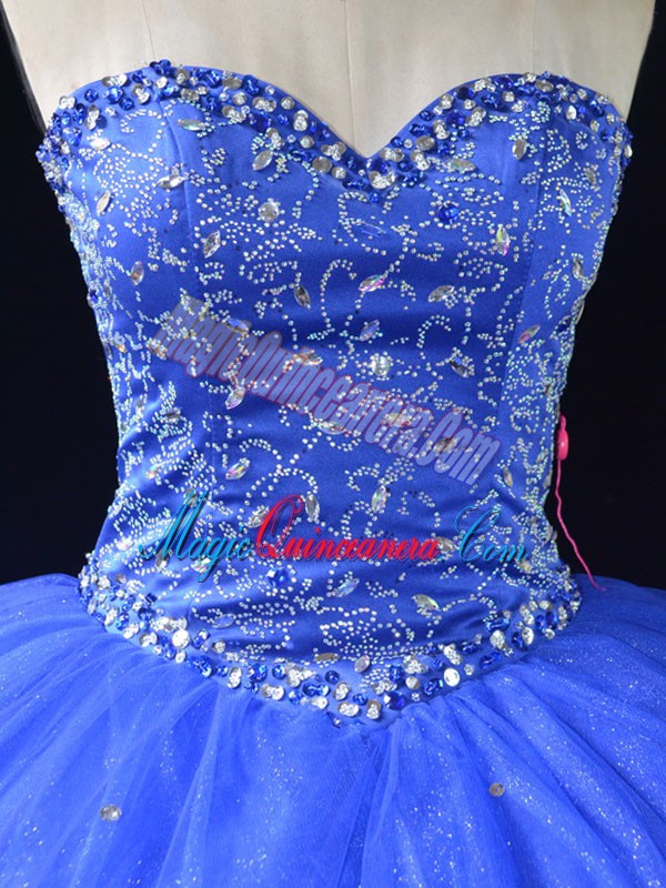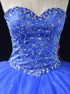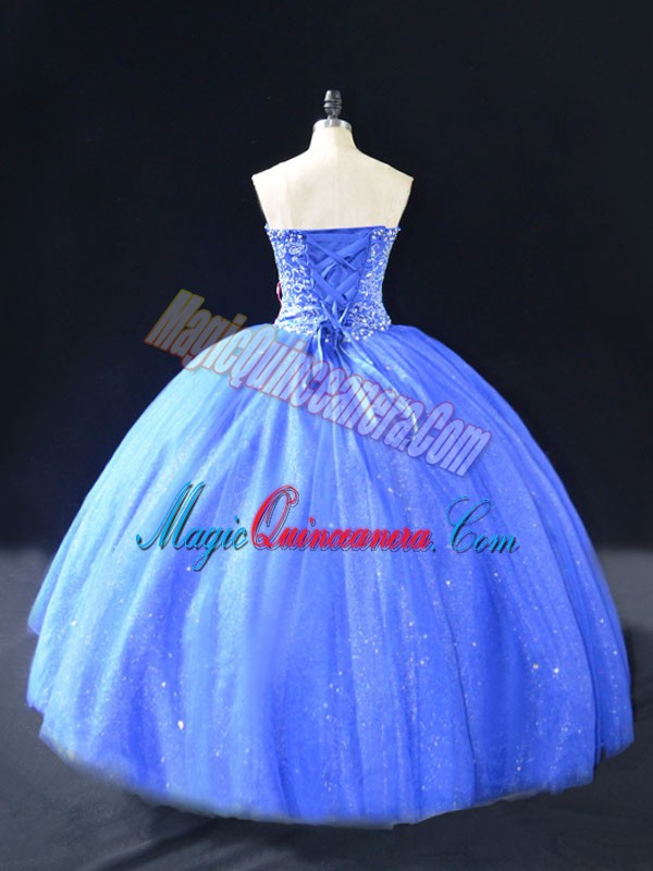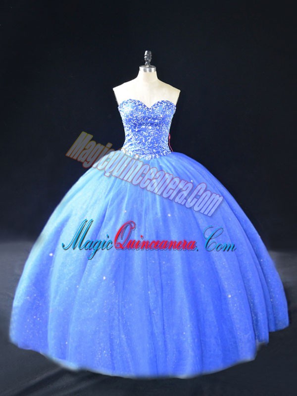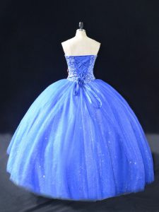 , Sleeveless Tulle Floor Length Lace Up Sweet 16 Dress in Blue with Beading