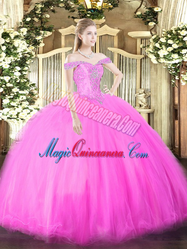 Sleeveless Tulle Floor Length Lace Up Vestidos de Quinceanera in Fuchsia with Beading