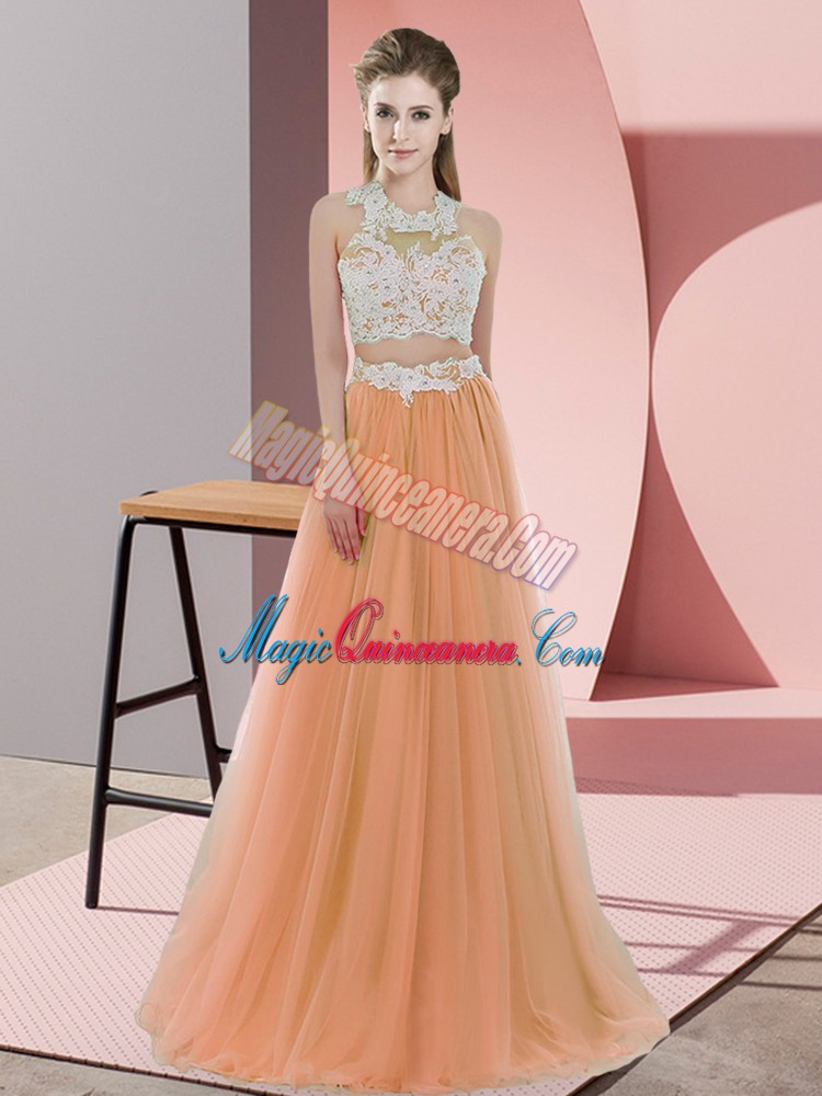 , Sleeveless Tulle Floor Length Zipper Damas Dress in Orange with Lace