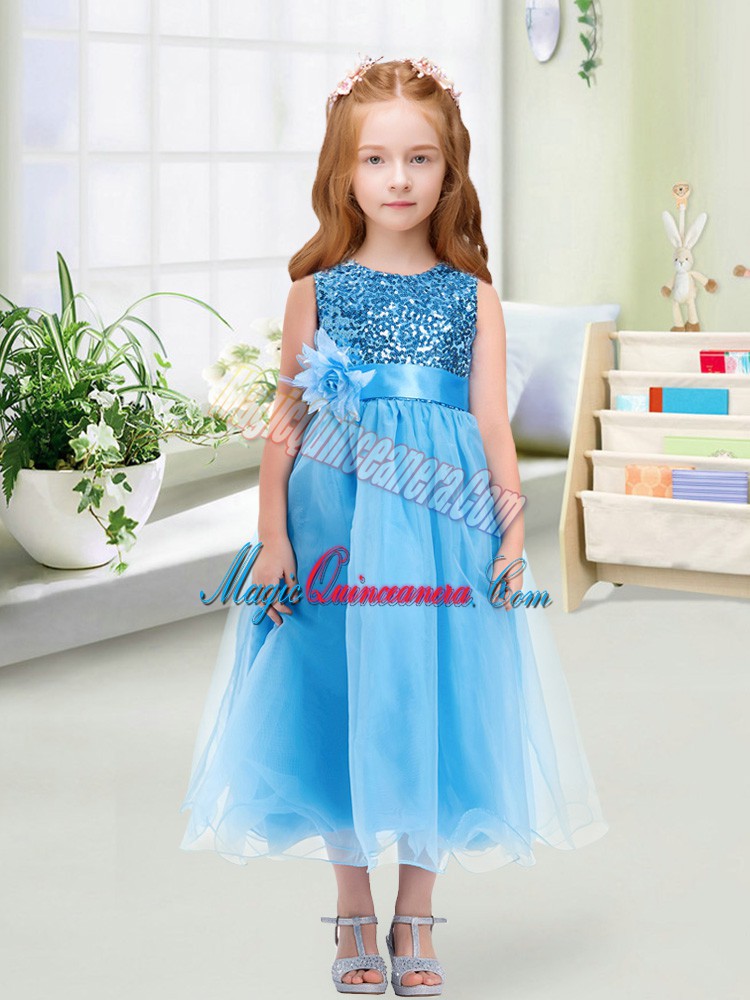 Sleeveless Zipper Tea Length Sequins and Hand Made Flower Pageant Dress for Girls