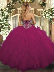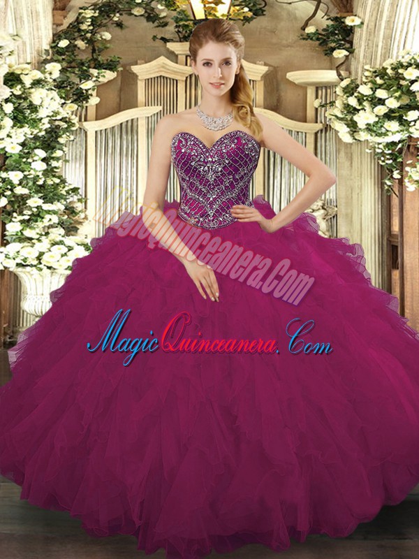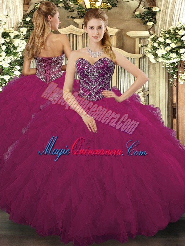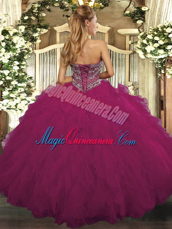 Smart Fuchsia Lace Up 15th Birthday Dress Beading and Ruffled Layers Sleeveless Floor Length