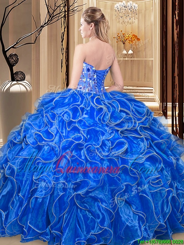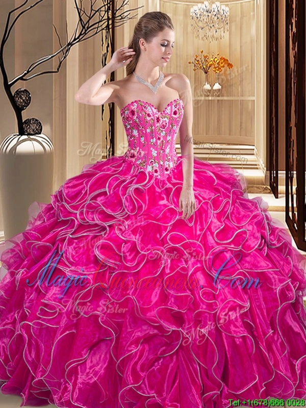Smart Fuchsia Organza Lace Up Quinceanera Dress Sleeveless Floor Length Embroidery and Ruffles