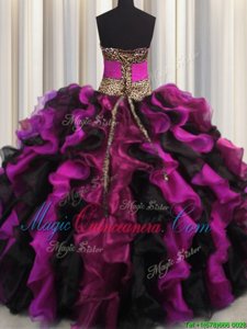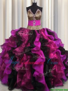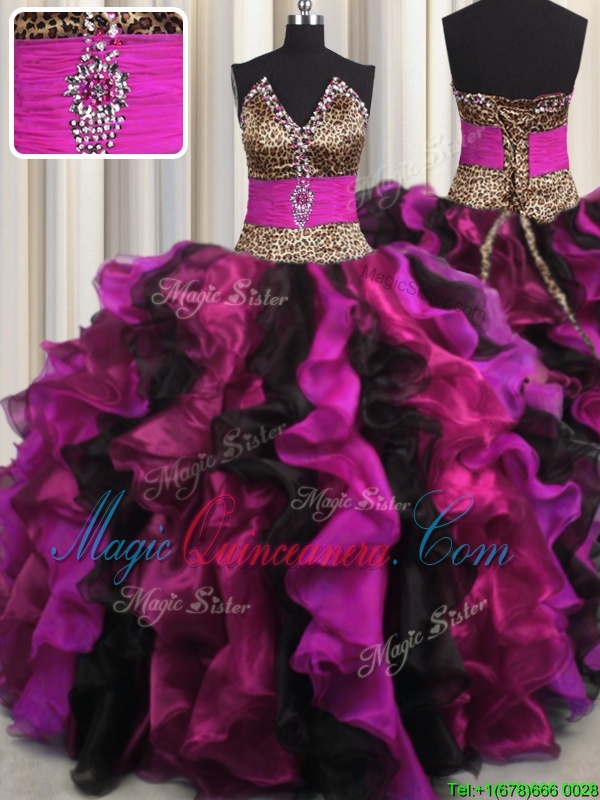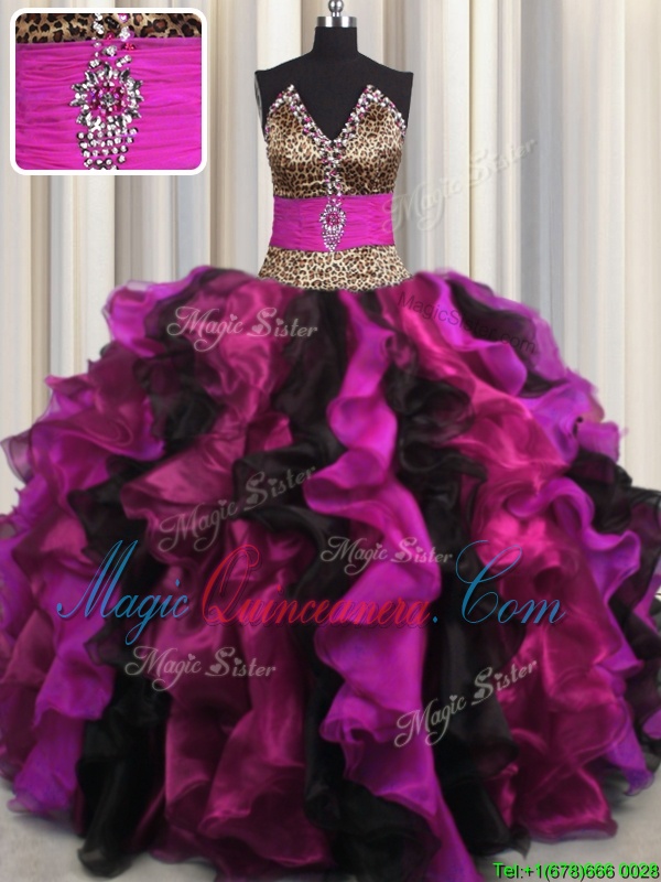 Smart Leopard V Neck Multi-color Ball Gowns Organza V-neck Sleeveless Beading and Ruffles Floor Length Lace Up Quinceanera Dresses
