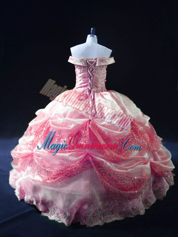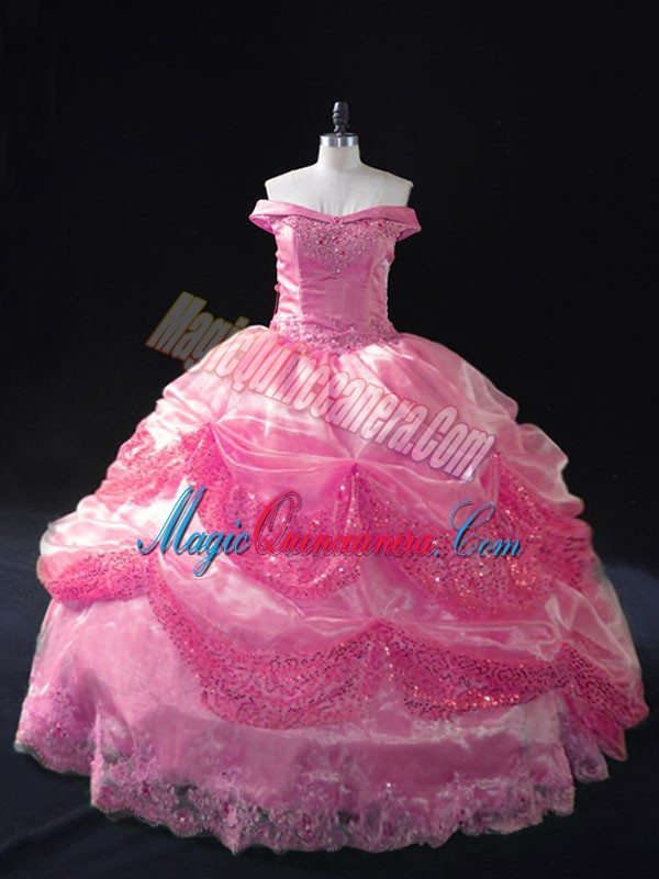 Smart Rose Pink Ball Gowns Beading and Sequins Quince Ball Gowns Lace Up Organza Sleeveless Floor Length