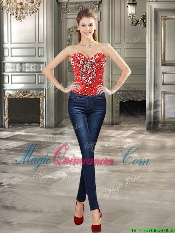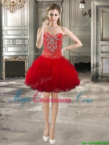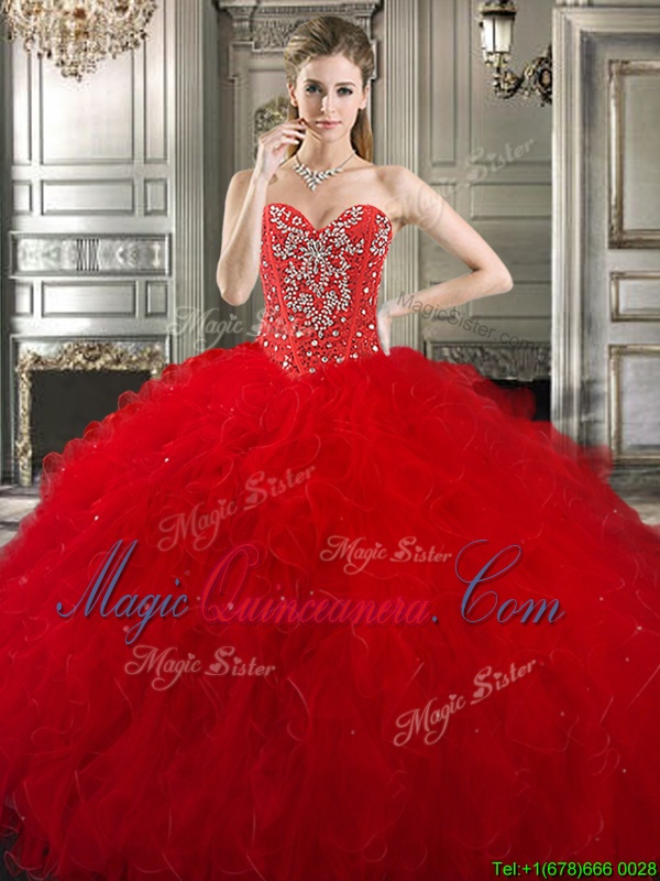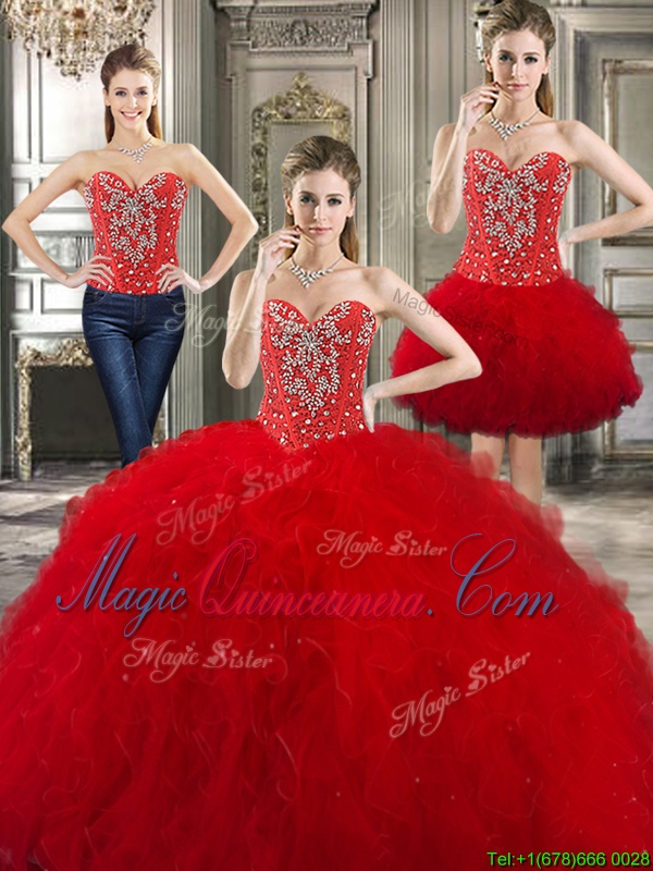 Smart Three Piece Red Ball Gown Prom Dress Military Ball and Sweet 16 and Quinceanera and For with Beading and Ruffles Sweetheart Sleeveless Lace Up