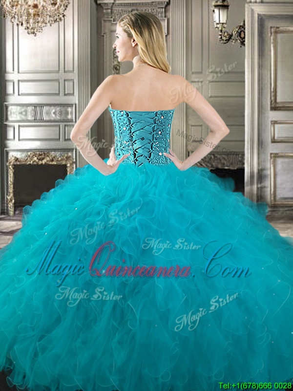 Four Piece Sweetheart Sleeveless Quinceanera Dresses Floor Length Beading and Ruffles Teal Tulle