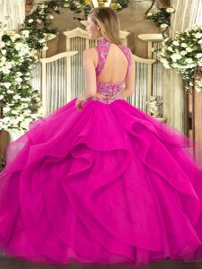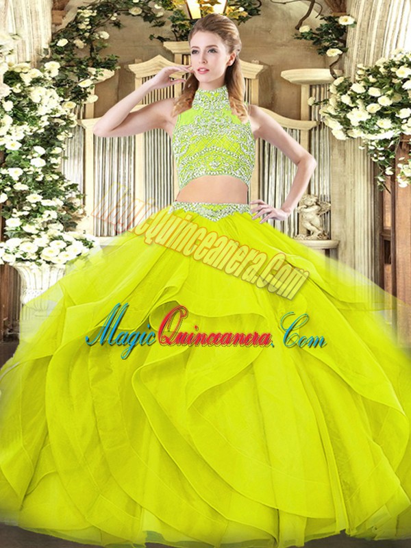 Sophisticated Sleeveless Tulle Floor Length Backless Quinceanera Dress in Yellow Green with Beading and Ruffles