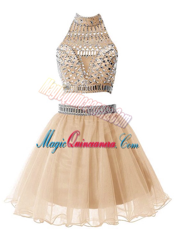 Spectacular Champagne Dama Dress for Quinceanera Party and Wedding Party with Beading High-neck Sleeveless Zipper