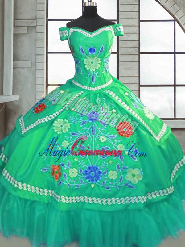 Spectacular Green Ball Gowns Taffeta Sweetheart Short Sleeves Beading and Embroidery Floor Length Lace Up Quinceanera Dress