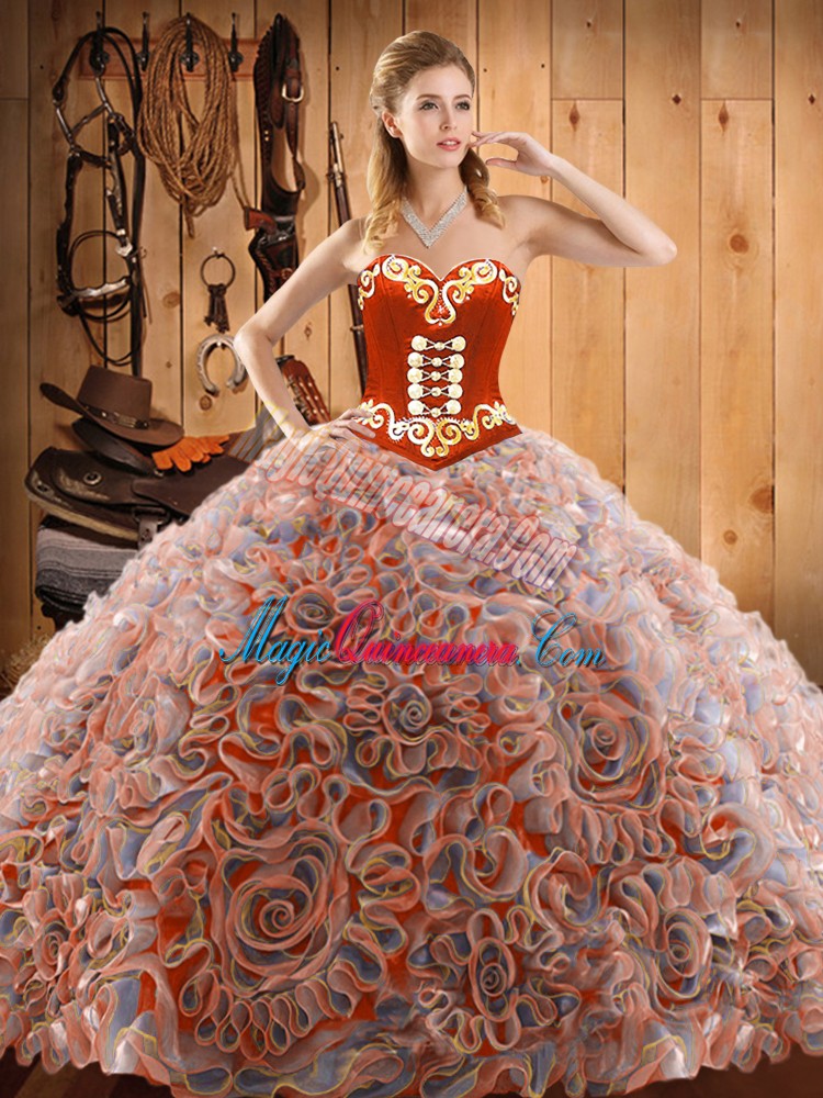Spectacular Multi-color Ball Gowns Satin and Fabric With Rolling Flowers Sweetheart Sleeveless Embroidery With Train Lace Up Quinceanera Dresses Sweep Train