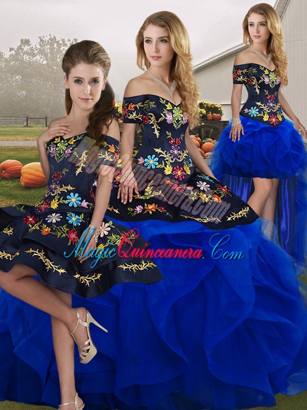 Spectacular Off The Shoulder Sleeveless Quinceanera Gowns Floor Length Embroidery and Ruffles Blue And Black Tulle