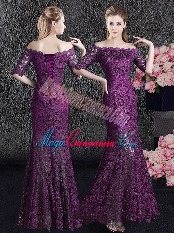 Spectacular Purple Mermaid Lace Off The Shoulder Half Sleeves Lace Floor Length Lace Up Mother Of The Bride Dress