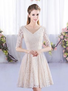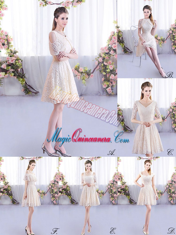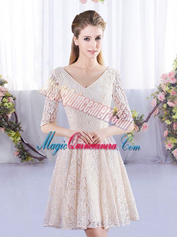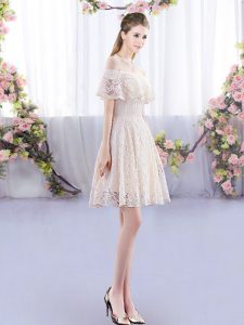 Spectacular Scoop Short Sleeves Lace Up Lace Dama Dress for Quinceanera in Champagne