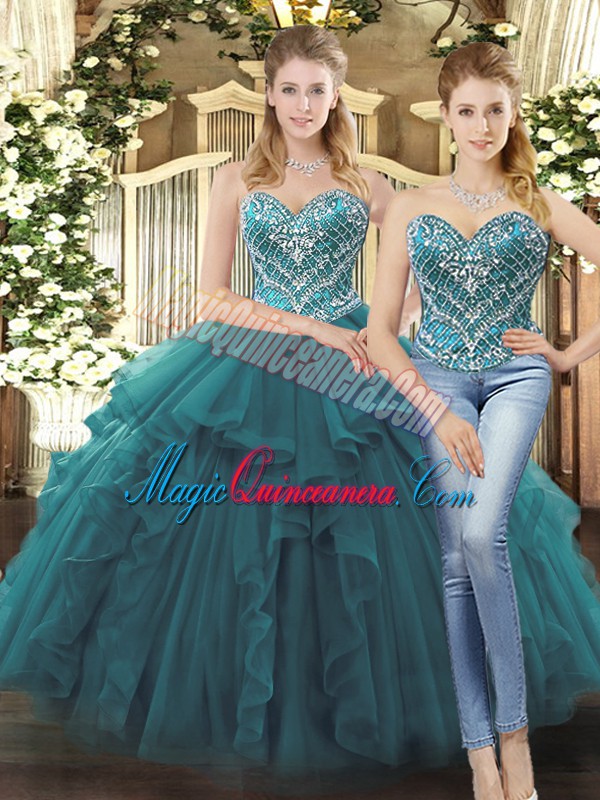 , Spectacular Teal Sweetheart Lace Up Beading and Ruffles Sweet 16 Dress Sleeveless