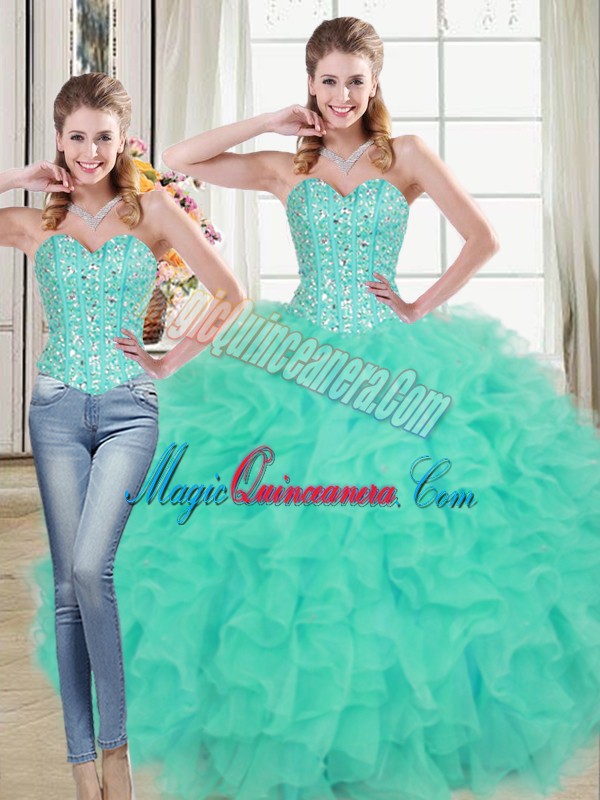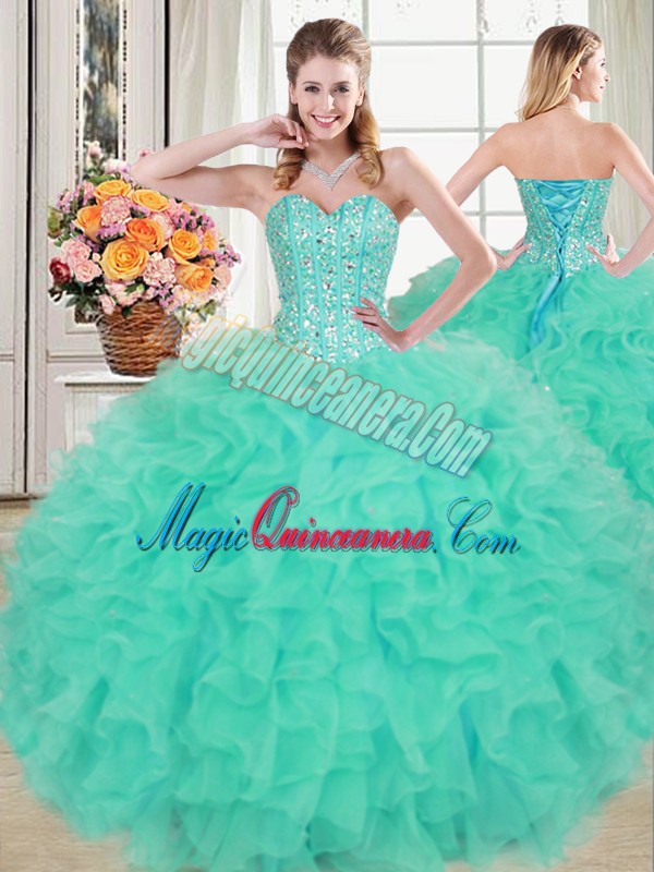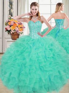 Spectacular Turquoise Two Pieces Organza Sweetheart Sleeveless Beading and Ruffled Layers Lace Up Quinceanera Dress Brush Train