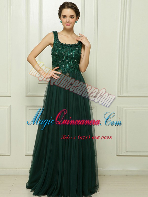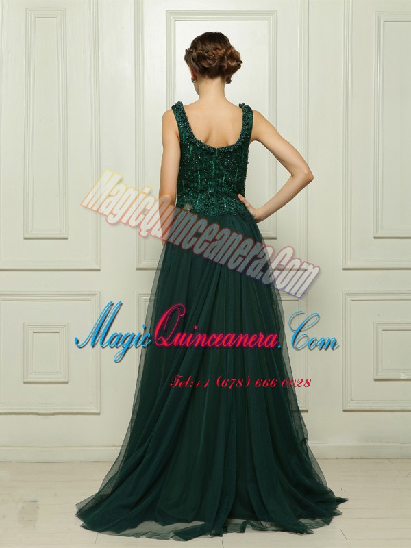 Square Sleeveless Tulle Prom Dress Beading Sweep Train Zipper