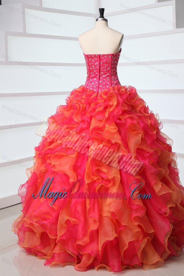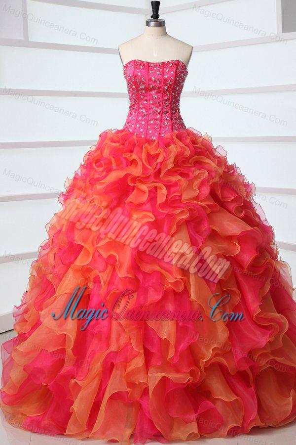 Strapless Red and Orange Red Quinceanera Dress with Beading and Ruffles