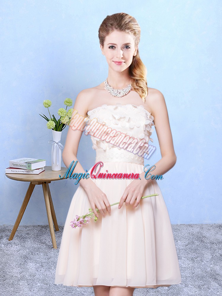 Strapless Sleeveless Court Dresses for Sweet 16 Knee Length Appliques Champagne Chiffon