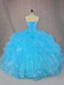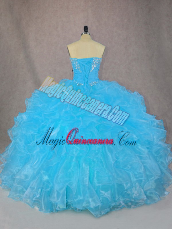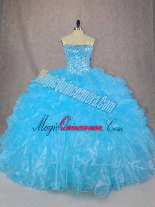 Strapless Sleeveless Lace Up Quinceanera Gowns Blue Organza