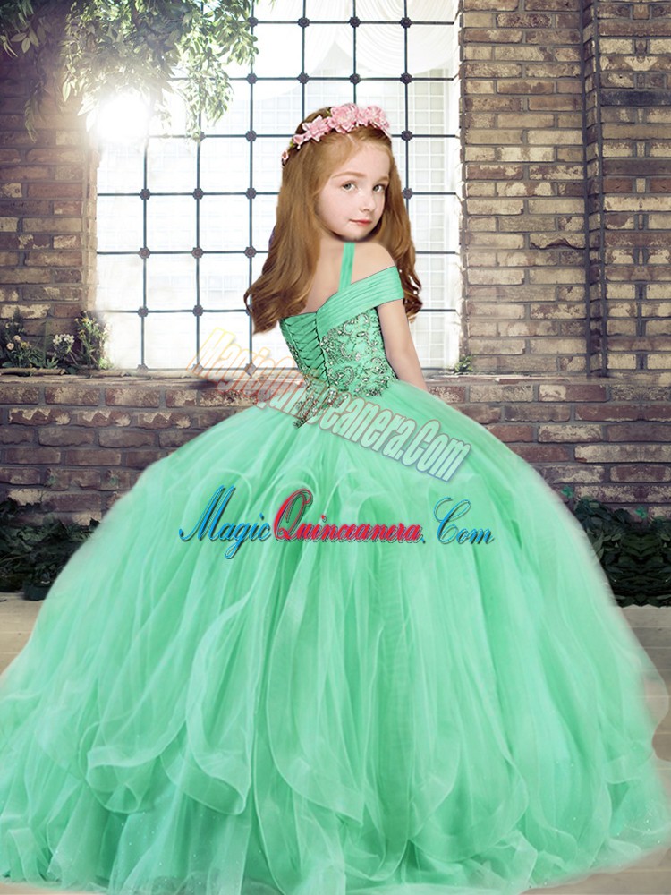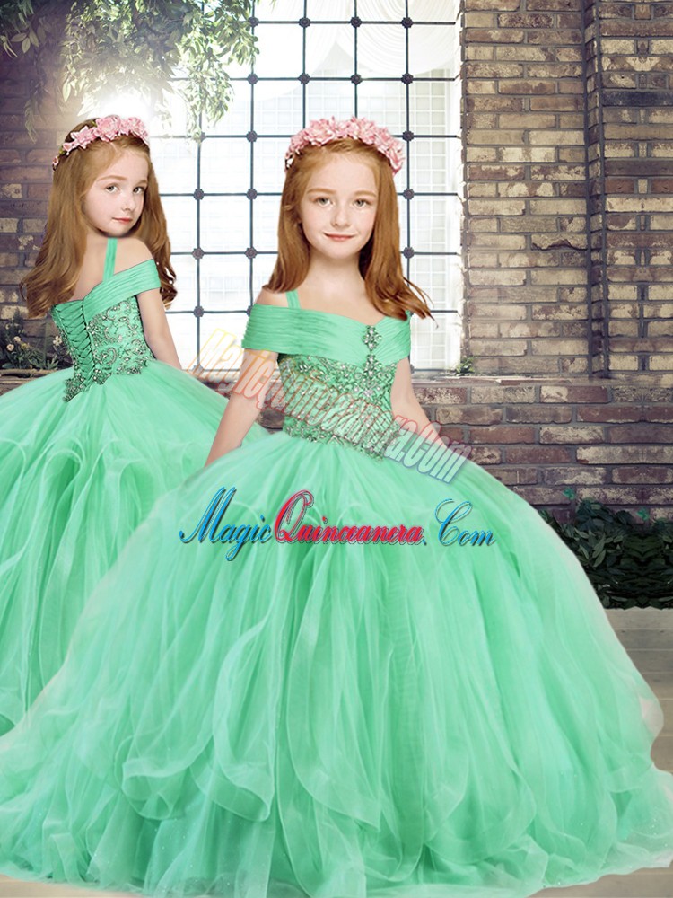Straps Sleeveless Little Girls Pageant Dress Floor Length Beading and Ruffles Apple Green Tulle