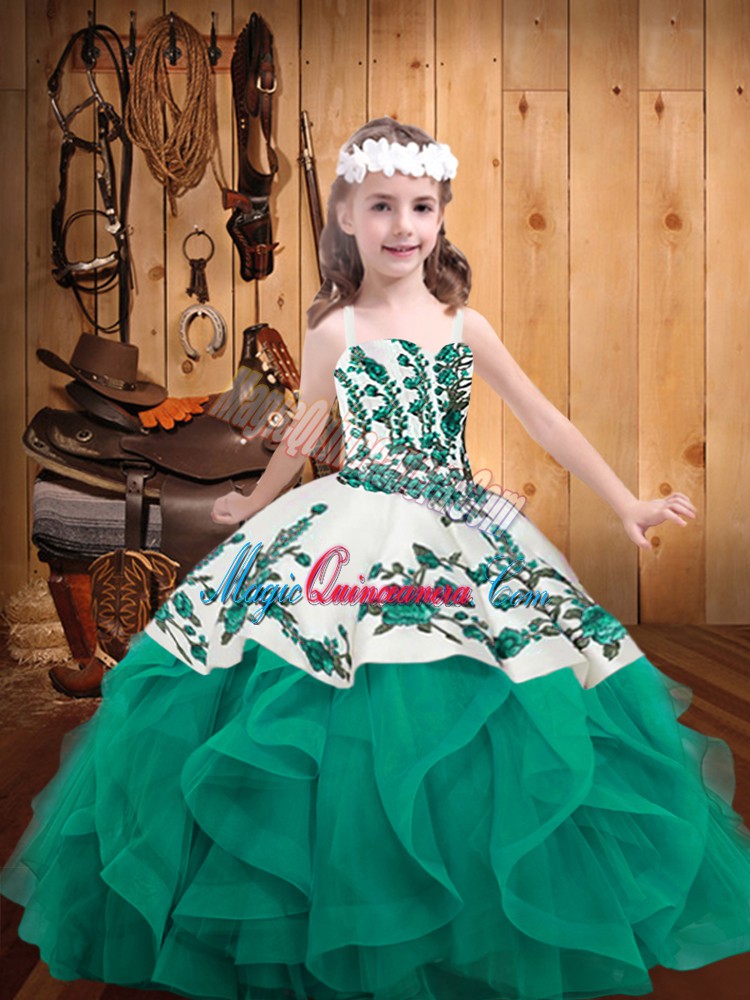 , Straps Sleeveless Pageant Dresses Embroidery and Ruffles Turquoise Organza