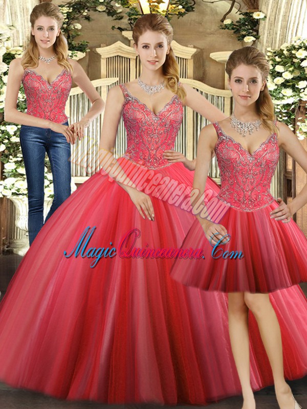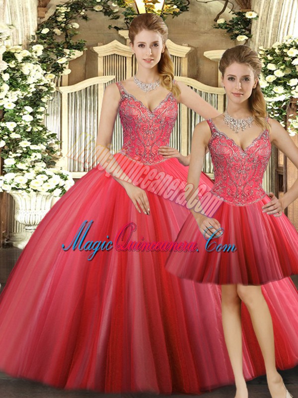 , Straps Sleeveless Tulle Ball Gown Prom Dress Beading Lace Up