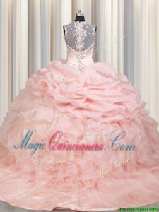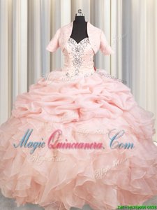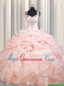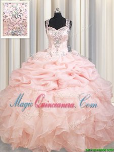 Straps Straps Sleeveless Organza Brush Train Zipper Quinceanera Gown in Pink for with Beading and Ruffles and Pick Ups