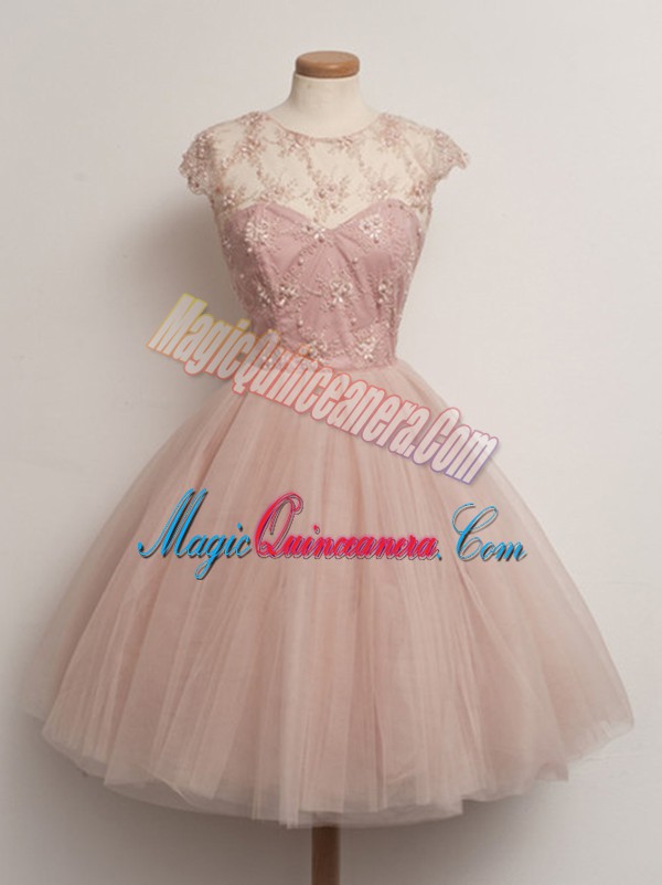 Stunning Knee Length Lace Up Vestidos de Damas Peach for Prom and Party and Wedding Party with Lace