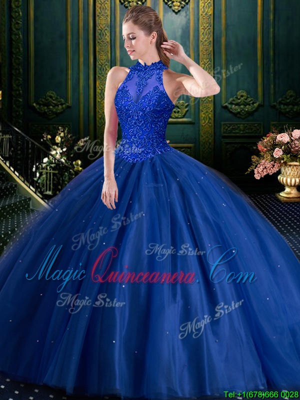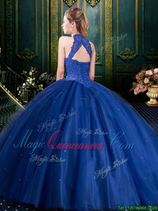 Glorious Halter Top Sleeveless Tulle Sweet 16 Dresses Appliques Lace Up