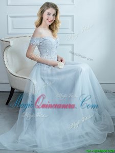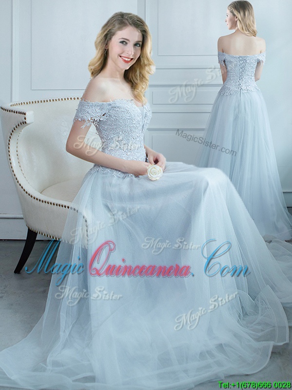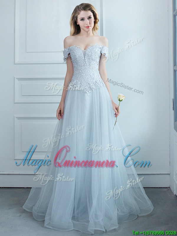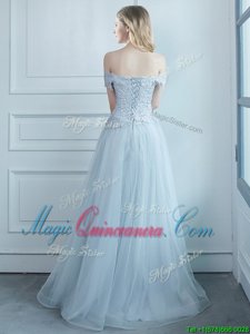 Stylish Off the Shoulder Light Blue Lace Up Vestidos de Damas Beading and Appliques Cap Sleeves Floor Length