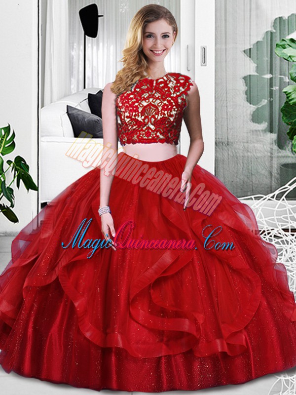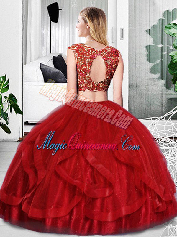 Stylish Wine Red Two Pieces Lace and Ruffles Ball Gown Prom Dress Zipper Tulle Sleeveless Floor Length