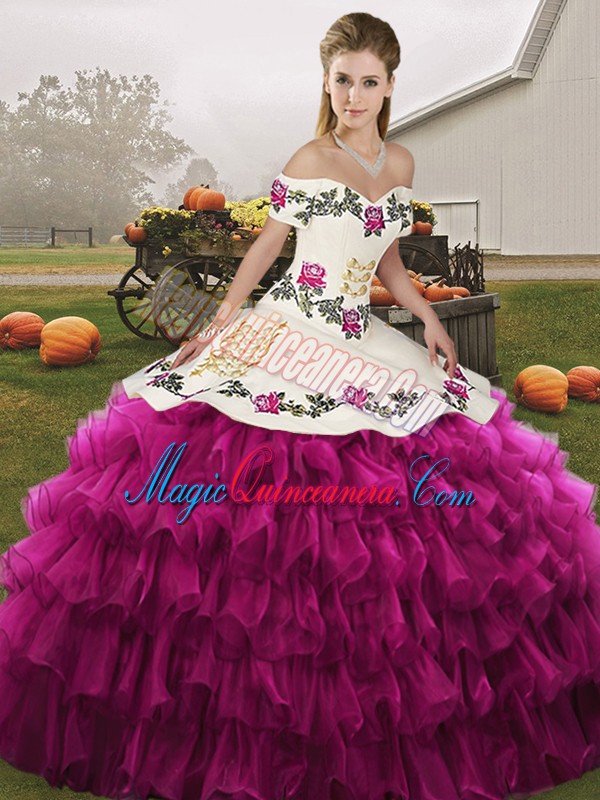 Suitable Fuchsia Organza Lace Up Off The Shoulder Sleeveless Floor Length 15 Quinceanera Dress Embroidery and Ruffled Layers