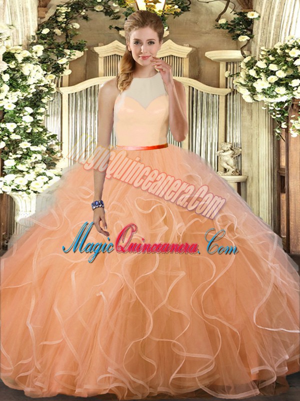 Suitable High-neck Sleeveless Backless Sweet 16 Dresses Peach Tulle