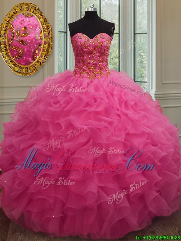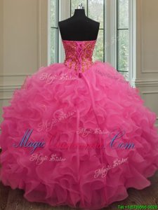 Suitable Hot Pink Ball Gowns Sweetheart Sleeveless Organza Floor Length Lace Up Beading and Ruffles Quinceanera Gown