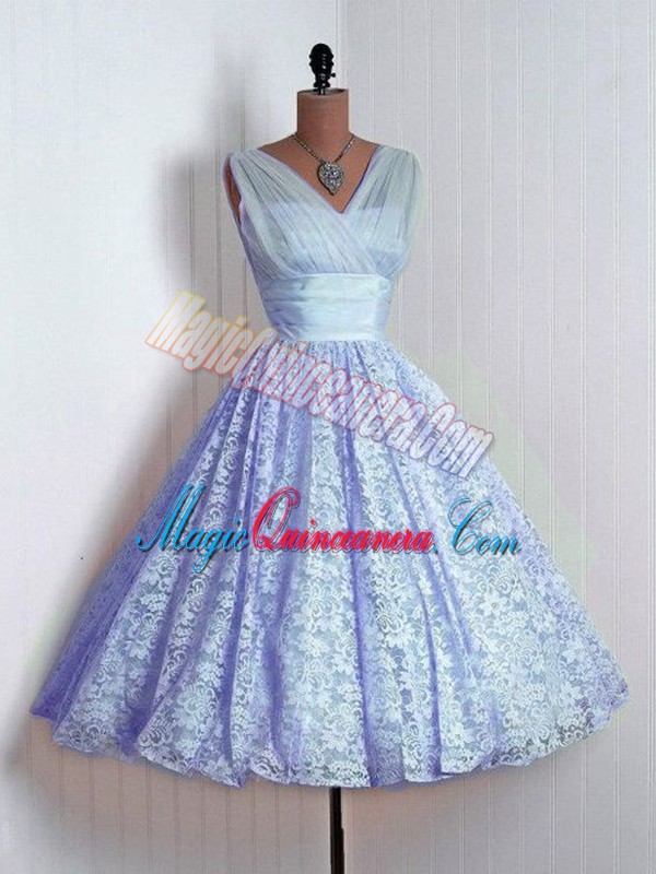 Suitable Lace V-neck Sleeveless Lace Up Lace Quinceanera Dama Dress in Lavender